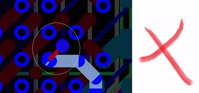对于导通孔密集的区域,要注意避免孔在电源和地层的挖空区域相互连接,形成对平面层的分割,从而破坏平面层的完整性,并进而导致信号线在地层的回路面积增大。
