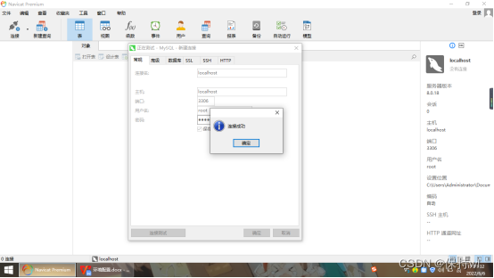 全部填写完毕后点击测试连接,出现如图所示提示,即安装成功,点击确定后再点击确定