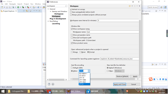 然后搜索框搜索workspace,再点击workspace,将Other处改为UTF-8,再点击Apply