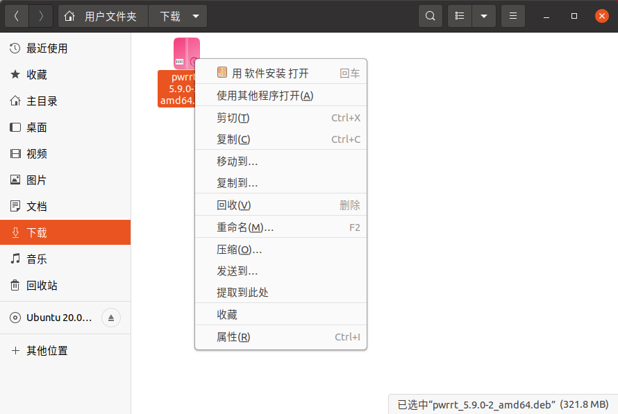 进入下载目录,在下载文件“pwr59_5.9.0-1_amd64.deb”图标上右键单击,在快捷菜单上单击“用软件安装打开”