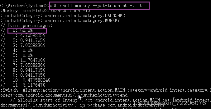 用于指定伪随机数生成器的seed值,如果seed相同,则两次Monkey测试所产生的事件序列也相同的.示例: monkey测试1:adb shell monkey -s 10 100