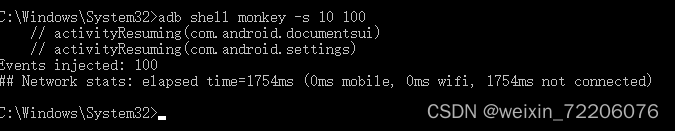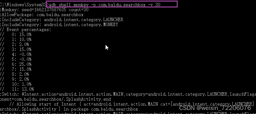level 0: adb shell monkey -p 包名 -v 30 // 缺省值,仅提供启动指示,,测试完成和最终结果等少量信息.