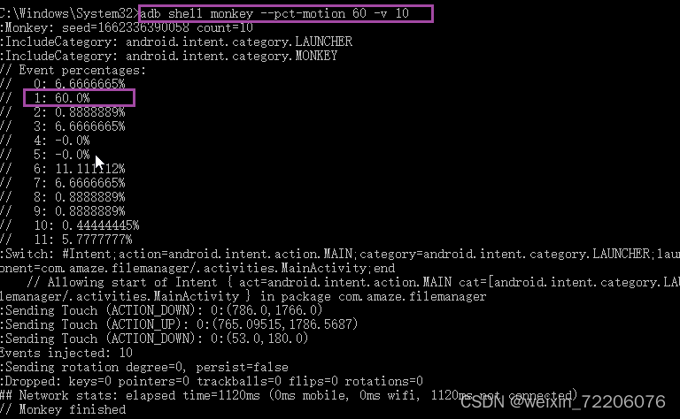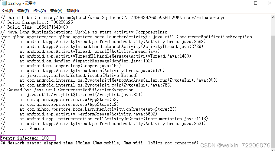 正常情况, 如果Monkey 测试顺利执行完成,在log的最后,会打印出当前执行事件的次数和所花费的时间; // Monkey finished 代表执行完成