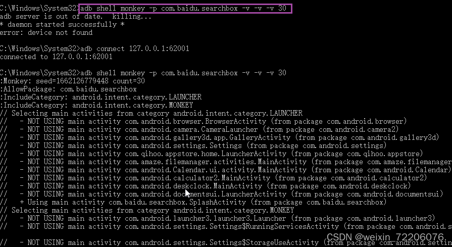level 2: adb shell monkey -p 包名 -v -v -v 30 //最为详细的日志,包括了测试中选中的/未选中的Activity 信息.