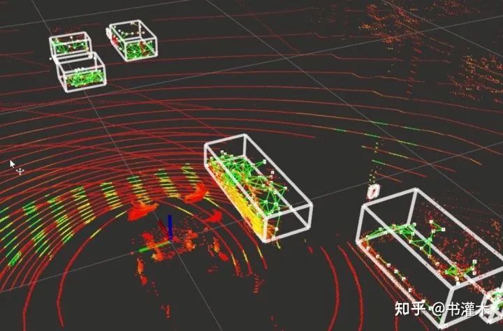 这就是处理的效果图,能够描述车辆的外形轮廓。但就是计算速度慢,得170ms+,无法实时处理点云数据,不适合无人驾驶,但是如果用在离线处理,比如slam上去除动态目标物,兴许效果更好,我没有尝试。运算速度慢的原因是体素过滤后计算了每个点的法向量,使用周边一定距离内的所有点进行主成分析,体素过小和周边点太多导致计算缓慢,毕竟需要计算每个点的法向量,然后再区域生长聚合目标物。我尝试了扩大体素和使用最近的若干点,虽然提高了计算速度,但是轮廓精度降低很多。在这种两难的场景下,我更倾向于保证精度,所以将代码保留,如果以后做slam可以使用。LCCP的编写和调试花废了太长时间,效果又没有达到预期。所以不得不立刻改变方向,加快进度,如果年底目标达不到,扣钱是肯定的。在金钱的诱惑下,我给屁股上扎了两针鸡血~~~。更改的方向锁定在速度快,越快越好,精度不能太低,识别距离50米以上。最后发现了这篇神文--Fast Multi-Pass 3D Point Segmentation Based on a Structured Mesh Graph for Ground Vehicles。算法实现后是真的快,单32线雷达只需要17ms,一个32线加两个16线融合后只需要22ms,我惊了。看到结果图的瞬间,我感觉已经达到了人生的巅峰,并且已经保证不用扣钱了,获取还能奖励点(做梦)。算法的核心思想就是利用激光雷达的数据分层结构,论文中有一步拟合多项式,我去掉了,原因是会拖慢运算速度,而且效果也没有多大提升。年底时,用这套目标识别算法,再加上去年的目标跟踪,成功的在环境较为复杂的路面实现了无人驾驶。环境是一半越野路,一半公路,甚至了S形弯道等,实验结果达到了既定目标。不足之处:1. 3个雷达数据融合存在问题,我选择目标级别融合,也就是先识别目标物,然后目标物融合跟踪。只有障碍物被跟踪若干周期后,等它稳定并且长期存在后,再输出给控制层,这就导致滞后。滞后的这几个周期会对控制有很大影响,车速慢就罢了,一旦车速快就会发生碰撞或剐蹭。2. 识别距离短,刚好达到50米的最低要求,分析原因是32线雷达斜向下安装,前向线不足导致,但是32线如果水平装,就会产生很大盲区,雷达安装离地大概有2.5米到3米。道路边界识别没啥好说的,就是先识别马路牙子或者隔离带或者护栏,然后线性拟合。我们有同事加入了kalman滤波,道路边界曲线稳定性有了极大提高。