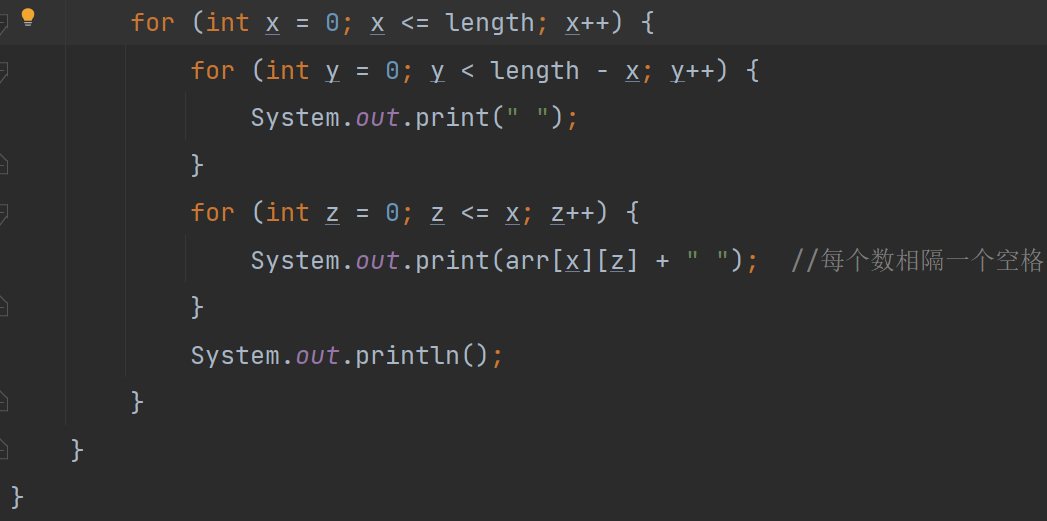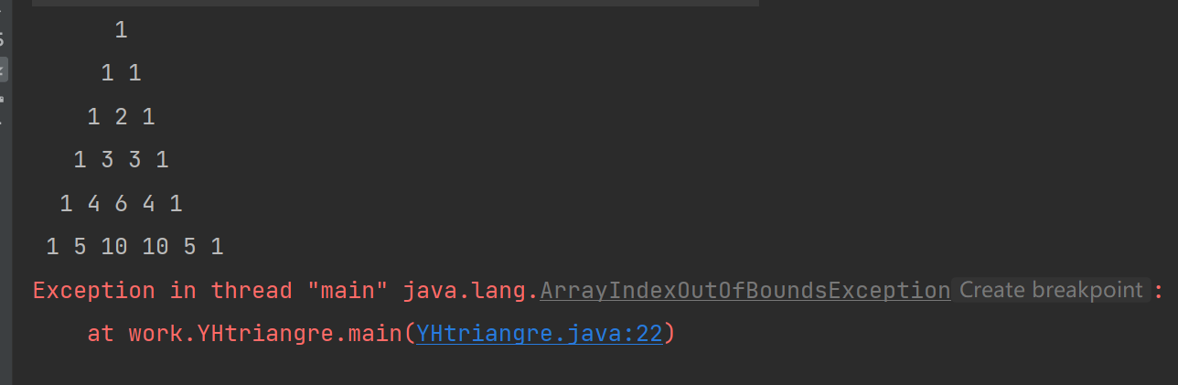 在运行后可以正常输出倒是出现了一个数组下标越界的异常,开始我认为是应为空格占了二维数组的空间,但是当我将int arr[][] = new int [length][length]改为int arr[][] = new int [length][2*length]后依然出现这个错误,认真检查代码后发现