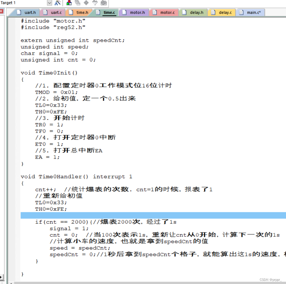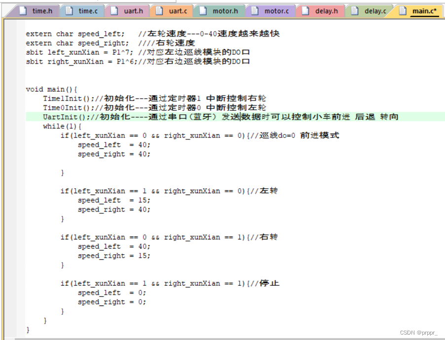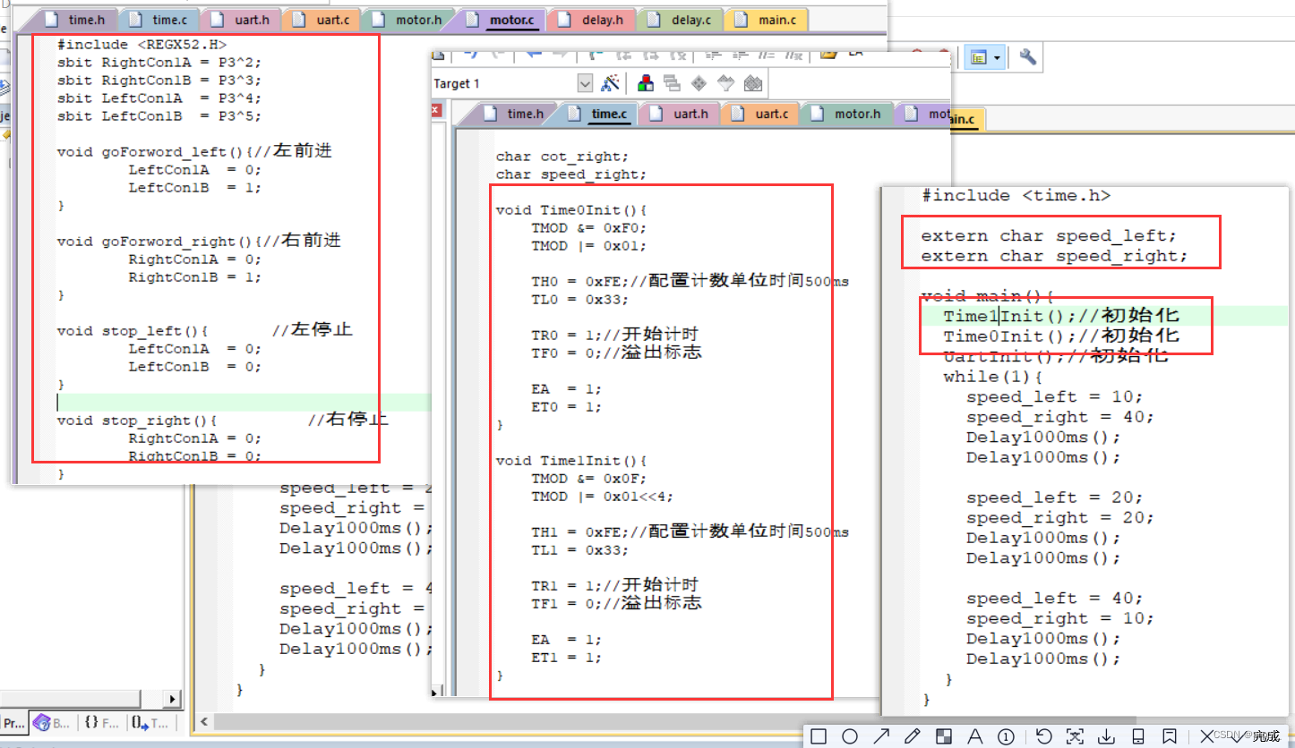 三、PWM控制小车速度(原理:在这个时间段内20ms---前进所占比例越大转速越快、、PWM分模块控制左右轮速度---实现转弯功能。(motor--电机控制器分模块、左轮定时器0、右轮定时器1分别控制两个不同转速、主函数传speed过去、)