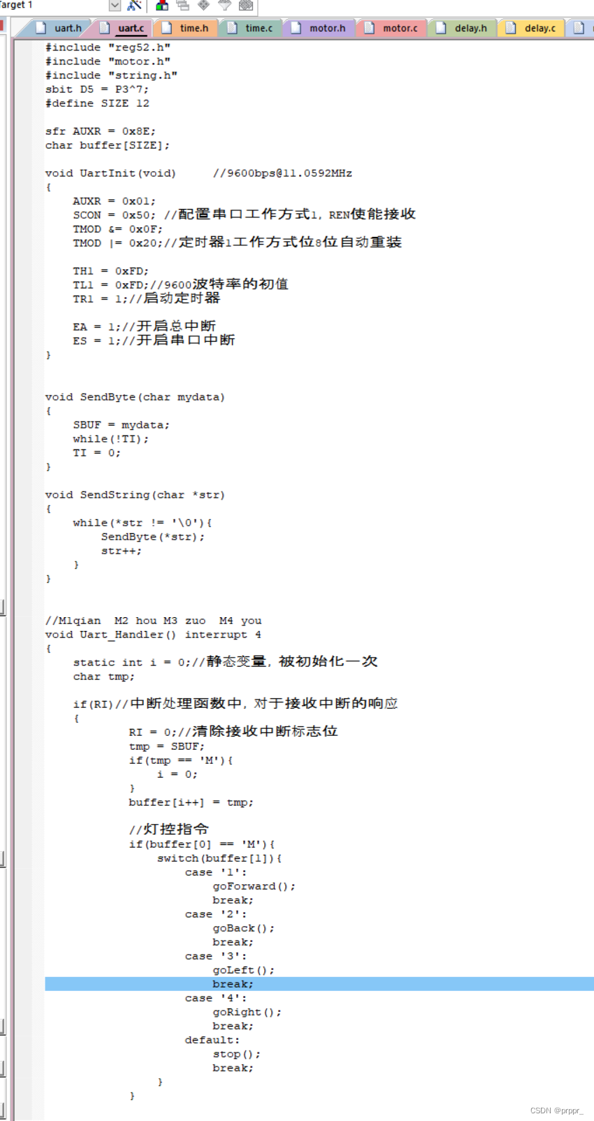 二、串口控制小车,串口初始化(pcom、scon配置sm0、1、ren是否接收、配置定时器1、串口通信速度--波特率9600、开始计数TR1 = 1,EA=1、ES = 1)、调用串口中断用tmp buffer【i】= tmp、i= 0;if buffer【i】='M' shitch(buffer[1]) ---case '1'/'2'/'3'/'4',调用电机函数控制上下左右------可以连接蓝牙、电动控制:主函数一直循环stop 当串口中断时会先处理中断