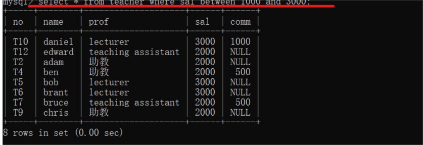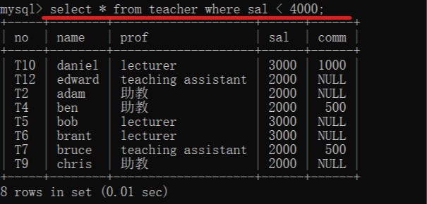 3.运用关系运算符查询:select * from 表名 where 字段名 运算符 数值(在单个字段的范围)