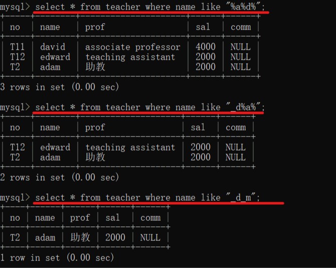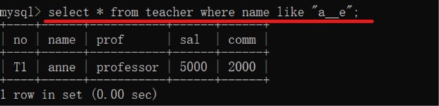 select *from 表名 where 字段名 like “a__e”;(根据前后查询)