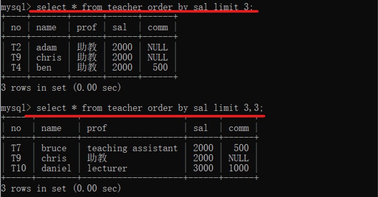 select * from 表名 order by 字段名 limit 条数,条数;(先几条再几条)(偏移量,条数)