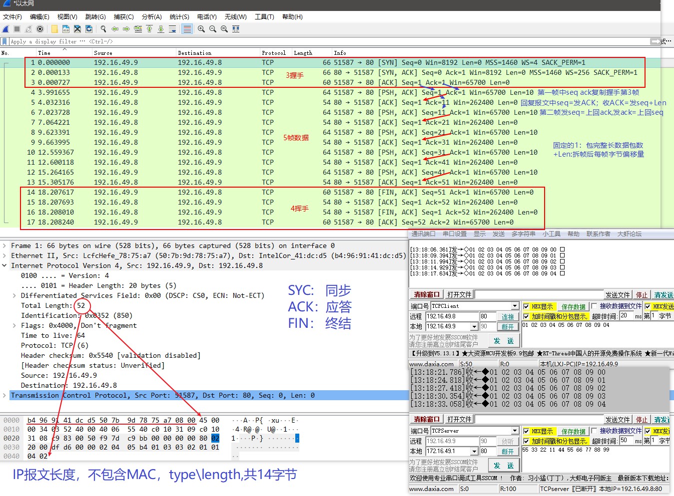 用两台电脑直连,网口调试软件模拟应用程序(一台client,一台server),wireshark抓取报文