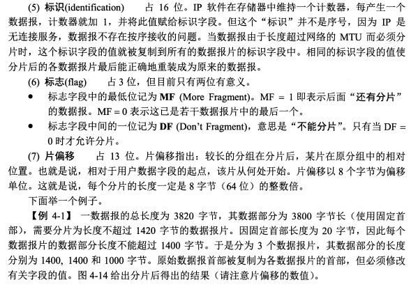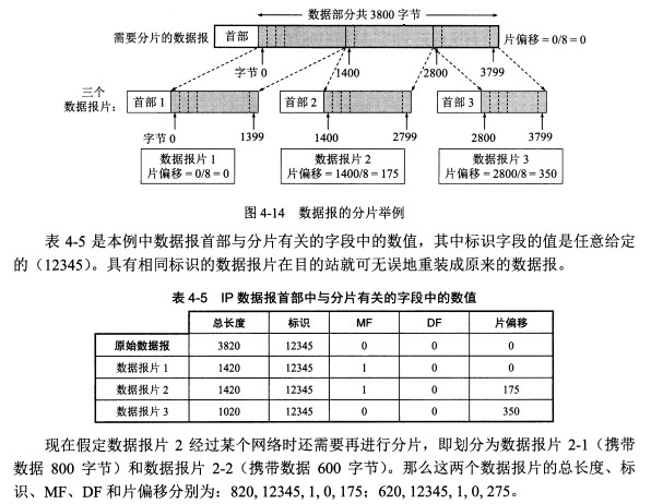 TCP发来的数据报如果大于MTU(IP层协议最大报文长度),需要在IP层将其拆分,接收方再将其拼装。拆分报文的标识都复制原标识。偏移以8字节为单位,从0开始算起。