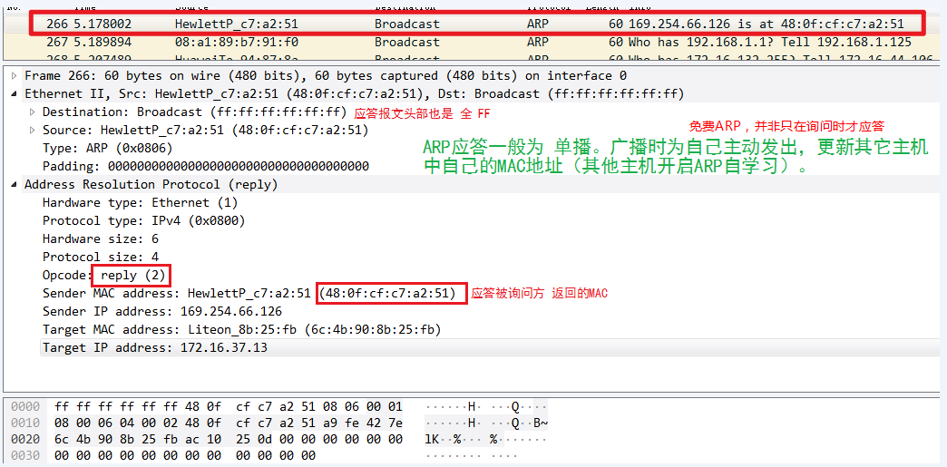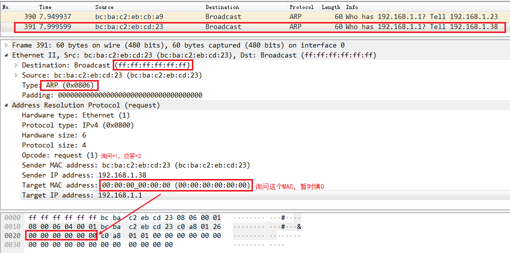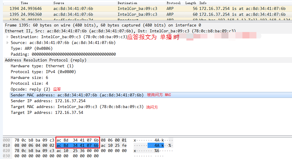 ARP报文抓取如下:询问、应答-单播、应答-组播(免费ARP)
