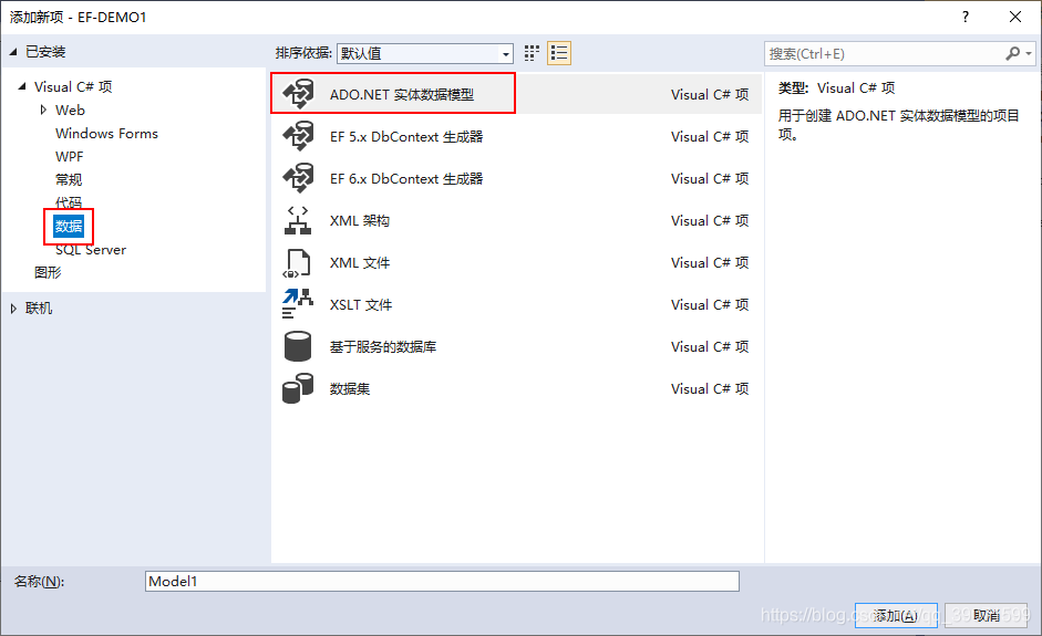 3.选择 C# 数据 ADO.NET实体数据模型: