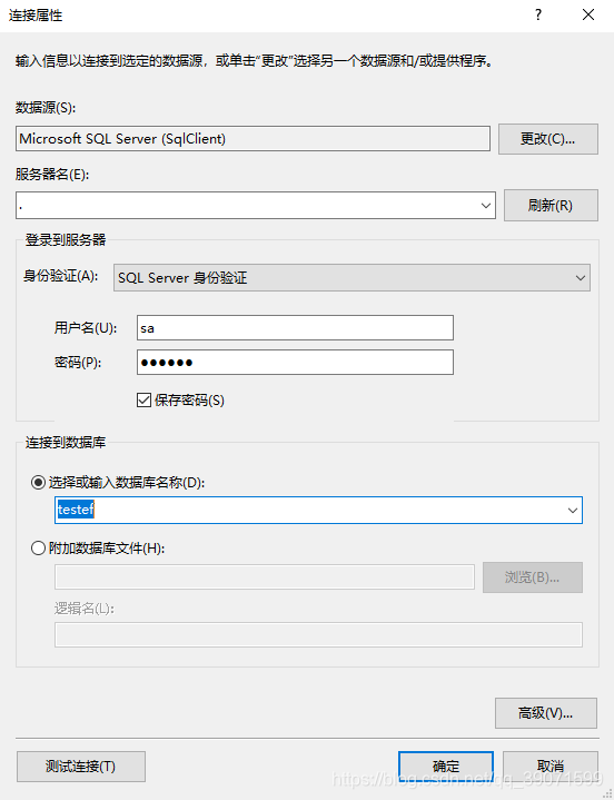 7.连接属性里面 根据情况填写信息 自己电脑上的SQL数据库里面需要先新建一个数据库