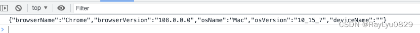 function userAgent () {let browserReg = {Chrome: /Chrome/,IE: /MSIE/,Firefox: /Firefox/,Opera: /Presto/,Safari: /Version\/([\d.]+).*Safari/,'360': /360SE/,QQBrowswe: /QQ/,Edge: /Edg/};let deviceReg = {iPhone: /iPhone/,iPad: /iPad/,Android: /Android/,Windows: /Windows/,Mac: /Macintosh/,};let userAgentStr = navigator.userAgentconst userAgentObj = {browserName: '', // 浏览器名称browserVersion: '', // 浏览器版本osName: '', // 操作系统名称osVersion: '', // 操作系统版本deviceName: '', // 设备名称}for (let key in browserReg) {if (browserReg[key].test(userAgentStr)) {userAgentObj.browserName = keyif (key === 'Chrome') {userAgentObj.browserVersion = userAgentStr.split('Chrome/')[1].split(' ')[0]} else if (key === 'IE') {userAgentObj.browserVersion = userAgentStr.split('MSIE ')[1].split(' ')[1]} else if (key === 'Firefox') {userAgentObj.browserVersion = userAgentStr.split('Firefox/')[1]} else if (key === 'Opera') {userAgentObj.browserVersion = userAgentStr.split('Version/')[1]} else if (key === 'Safari') {userAgentObj.browserVersion = userAgentStr.split('Version/')[1].split(' ')[0]} else if (key === '360') {userAgentObj.browserVersion = ''} else if (key === 'QQBrowswe') {userAgentObj.browserVersion = userAgentStr.split('Version/')[1].split(' ')[0]} else if (key === 'Edge') {userAgentObj.browserVersion = userAgentStr.split('Edg/')[1].split(' ')[0]}}}for (let key in deviceReg) {if (deviceReg[key].test(userAgentStr)) {userAgentObj.osName = keyif (key === 'Windows') {userAgentObj.osVersion = userAgentStr.split('Windows NT ')[1].split(';')[0]} else if (key === 'Mac') {userAgentObj.osVersion = userAgentStr.split('Mac OS X ')[1].split(')')[0]} else if (key === 'iPhone') {userAgentObj.osVersion = userAgentStr.split('iPhone OS ')[1].split(' ')[0]} else if (key === 'iPad') {userAgentObj.osVersion = userAgentStr.split('iPad; CPU OS ')[1].split(' ')[0]} else if (key === 'Android') {userAgentObj.osVersion = userAgentStr.split('Android ')[1].split(';')[0]userAgentObj.deviceName = userAgentStr.split('(Linux; Android ')[1].split('; ')[1].split(' Build')[0]}}}return userAgentObj}console.log(JSON.stringify(userAgent()))效果如下