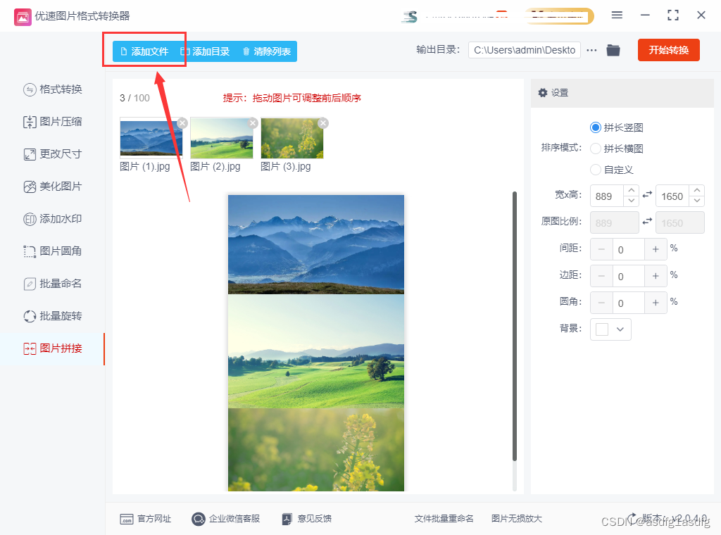 操作步骤2:接着是点击【添加图片】按钮,上传需要拼接的三张图片,如图所示,图片添加完成后会在软件的列表中有所显示,并且可以通过拖动图片来直接调整拼接顺序。