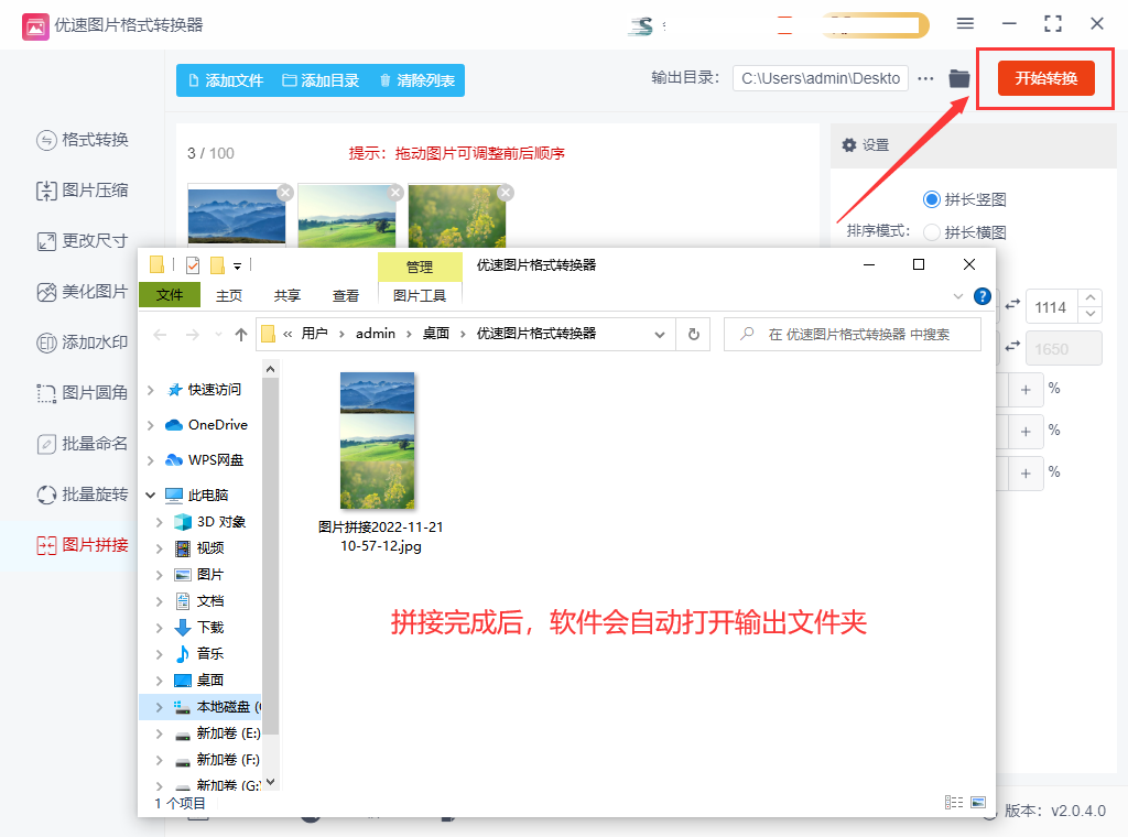 操作步骤4:设置成功后即可点击【开始转换】按钮,软件的拼接速度非常快,当我们点完转换按钮后,瞬间即可拼接完成,而且系统会把输出文件夹自动弹出并打开,方便用户直接查看拼接好的图片。