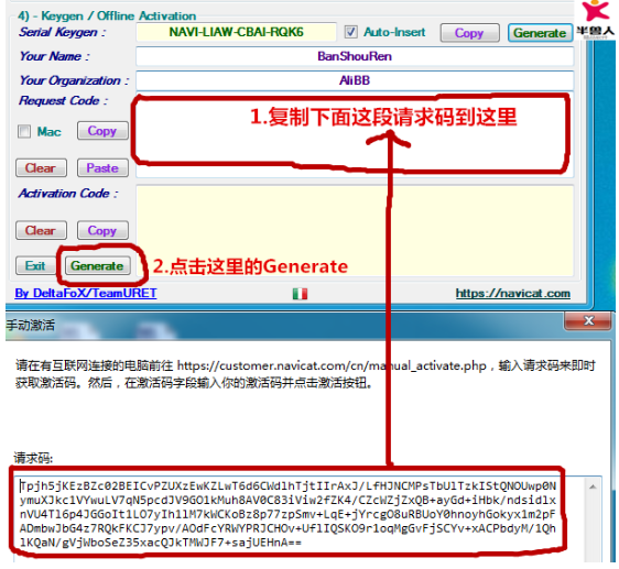 将Navicat手动激活窗口的请求码框中的内容复制到注册机的Request Code框中,点击Activation Code下面的Generate按钮