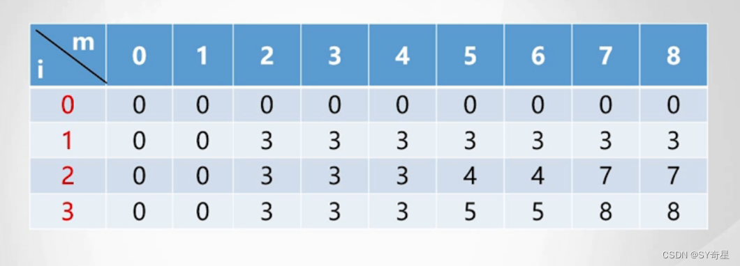 //外遍历宝石数量 for(int i=1;i<=n;i++){//内遍历背包容量 for(int j=1;j<=m;j++){//装不下 if(j<w[i]){f[i][j]=f[i-1][j]; }//装得下 else{//状态转移方程 f[i][j]=max(f[i-1][j],f[i-1][j-w[i]]+c[i]); }}}