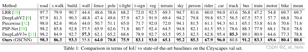 我们将GSCNN的性能与基线在区域精度方面(由mIoU衡量)进行比较。这些数字在验证集上报告,并在完整图像上计算(不裁剪)。在这个集合中,我们实现了2%的改进。特别地,我们注意到我们在小物件上取得了显著的改进:摩托车、交通标志、交通灯和电线杆。