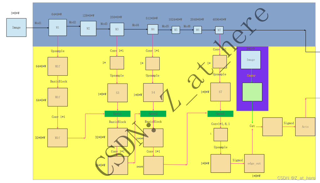 更新关于结构图中的分辨率和通道大小问题:使用CNN是wideresnet,分辨率从m1-m7分别是720,360,180,90,90,90,90。通道分别是64,128,256,512,1024,2048,4096.图片中我就不做更改了。shape stream中的分辨率和通道我没有详细去看。