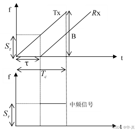 为发射信号与接收信号的频率差,设信号调频斜率为S,则经过