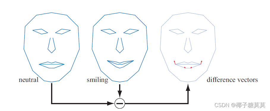 图4.15。给定两个嘴部姿态,计算一组差向量来控制内插,或者甚至外插。在变形目标中,差异向量用于将运动“添加”到中性面上。对于差值向量的正权重,我们得到一个微笑的嘴,而负权重会产生相反的效果。
