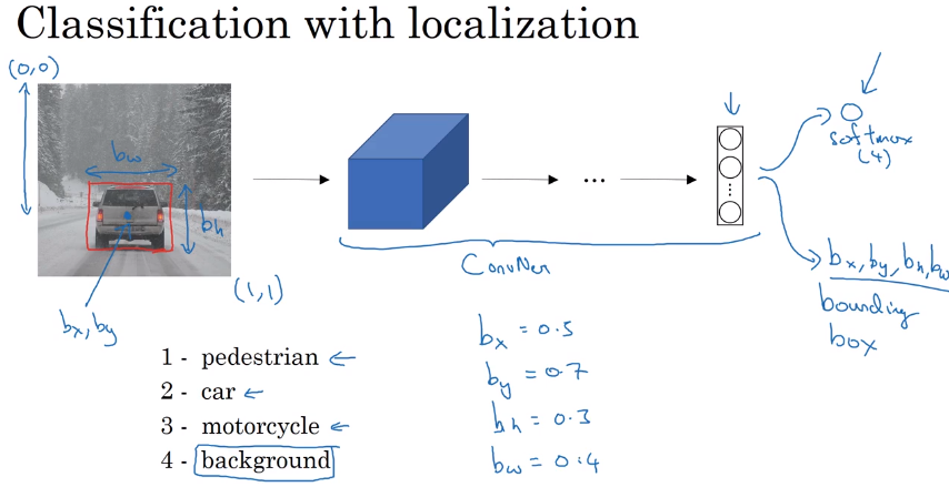 一般的图片分类问题,我们输入一张图片到多层卷积神经网络中,它会输出一个特征向量,并反馈给softmax单元来预测图片类型。如果我们想定位图片中的目标具体的位置,我们可以让神经网络多输出几个单元,具体来说就是让神经网络再多输出4个数字标记为bx、by、bh、bw。这四个数字是被检测对象的边界框的参数化表示。
