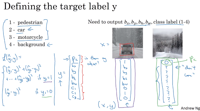 它是一个向量,第一个组件Pc表示是否含有对象,如果对象属于前三类,则Pc=1,如果是background或者其他,则Pc=0,即图片中没有我们指定的对象。若我们检测到对象,则接下来会输出目标边界框的四个参数bx、by、bw、bh。如果存在某个目标对象,则除了输出Pc=1,边界框的四个参数,同时还会输出C1、C2、C3,表示该对象属于1~3中的哪一类,属于哪一类其对应的Cx就为1,其余为C为0。如果输入图片中没有以上的3中对象或者说只有背景时,那么Pc=0,那么标签Y中的其他参数将变得毫无意义,不要考虑边框坐标以及Cx的值。