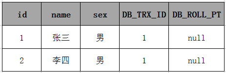 如下图,同一事务中(假设事务id=1)插入两条记录,记录的数据版本号为事务id=1,删除版本号为null