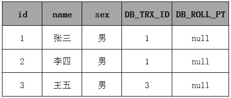 - 当我们创建表完成后,mysql会自动为每个表添加 数据版本号(最后更新数据的事务id)db_trx_id 删除版本号 db_roll_pt (数据删除的事务id) 事务id由mysql数据库自动生成,且递增。