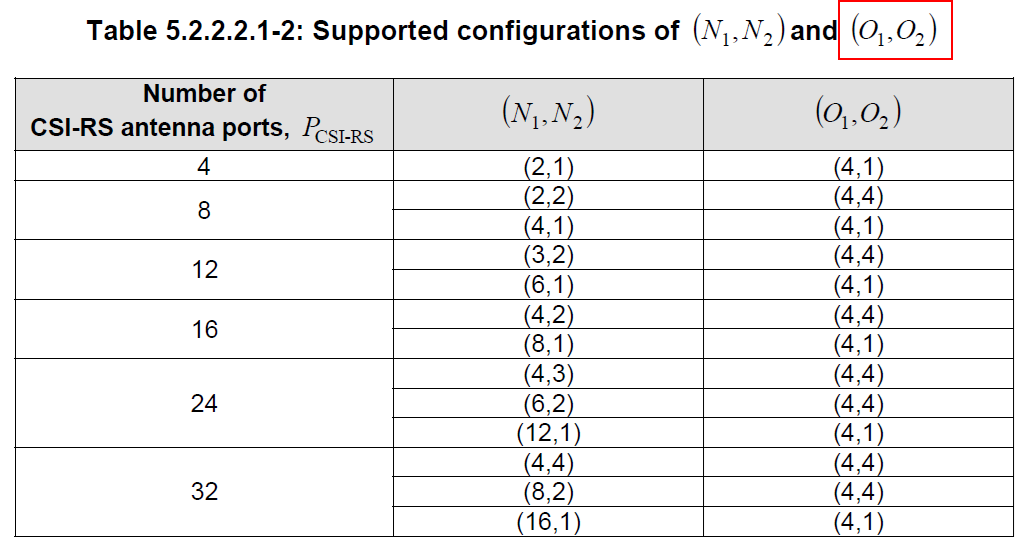 首先根据RRC参数中的n1-n2的配置,可以知道N1和N2的值,然后结合CSI-RS的端口数量,通过下表可以得到O1和O2。