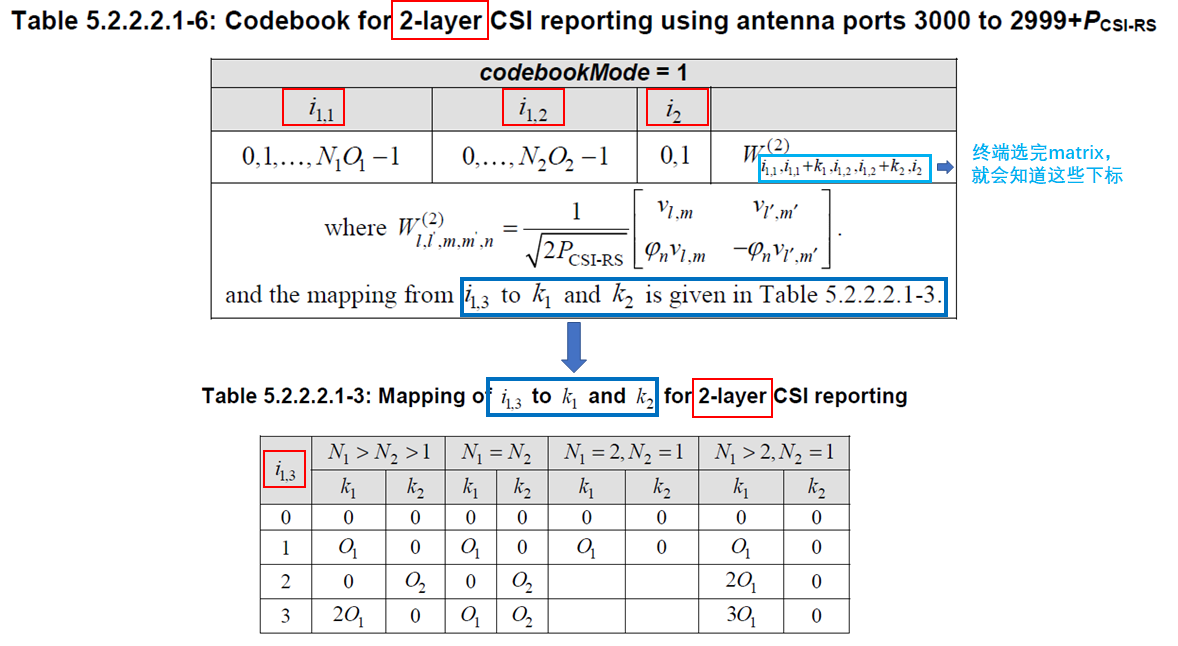 再看2 layer的codebook(如下图),终端在选定precoding matrix后就可以得到它的下标,从这个下标可以得到i1,1, i1,2, i2, k1和k2。PMI还需要i1,3啊?再根据i1,3与K1和k2的关系(如下图),可以得到i1,3。到此,我们可以得到要反馈的PMI={i1,1,i1,2,i1,3,i2}的值了。