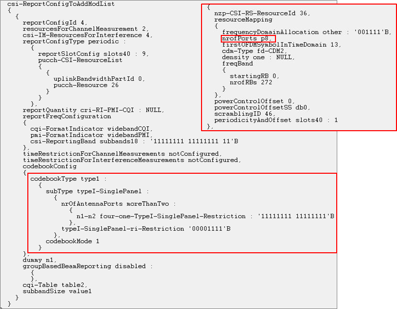 通过typeI-SinglePanel-ri-Restriction=‘00001111’可以知道gNB允许终端上报RI={0,1,2,3},即layer数量为{1,2,3,4},禁用了{5,6,7,8}layer。