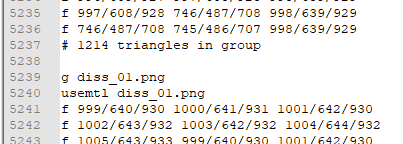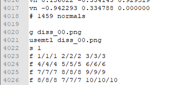 usemtl diss_00.png 表示当前模型分组使用的材质,每一个模型分组以usemtl 开始(一个模型存在有多个子物体的情况)