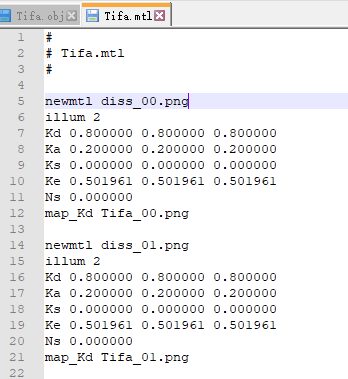 mtllib Tifa.mtl 记录当前obj文件对应的mtl文件的名称(一个mtl文件可以包含多个材质)
