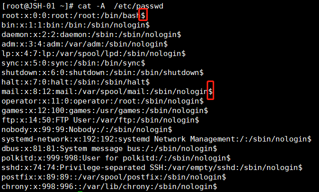 ①参数 -A :显示所有字符(如下图的 $ 表示行尾)