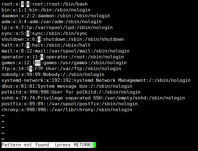 从前往后搜: / (查找下一个:n 查找上一个:N(shift+n)),高亮显示查找到的内容。例如:/0 查找0
