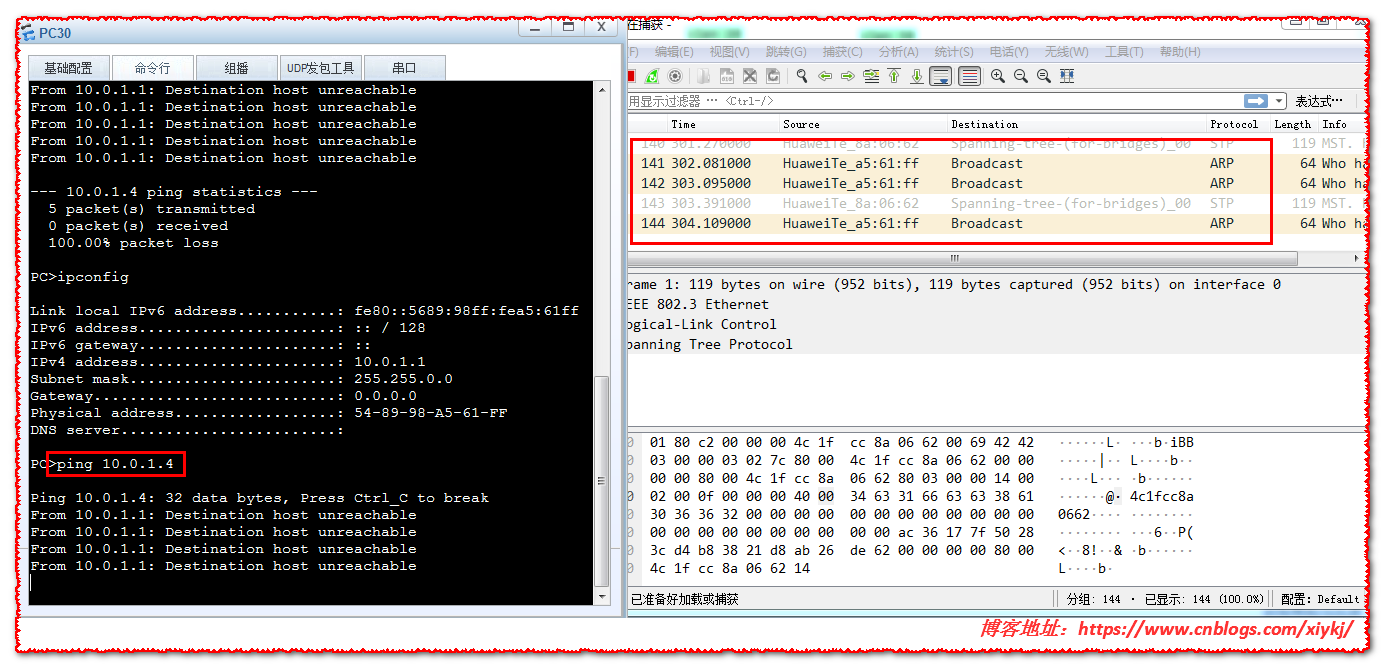 在PC 30上运行命令行窗口,ping 10.0.1.4发现是无法通讯的,在LSW 13交换机的 Ethernet0/0/3 口抓包是有ARP报文通过,但是交换机发现是报文VLAN标签是vlan 10的,所以交换机会丢弃这些数据包而不进行转发,在LSW 13交换机的 Ethernet0/0/2 口抓包是没有ARP报文经过