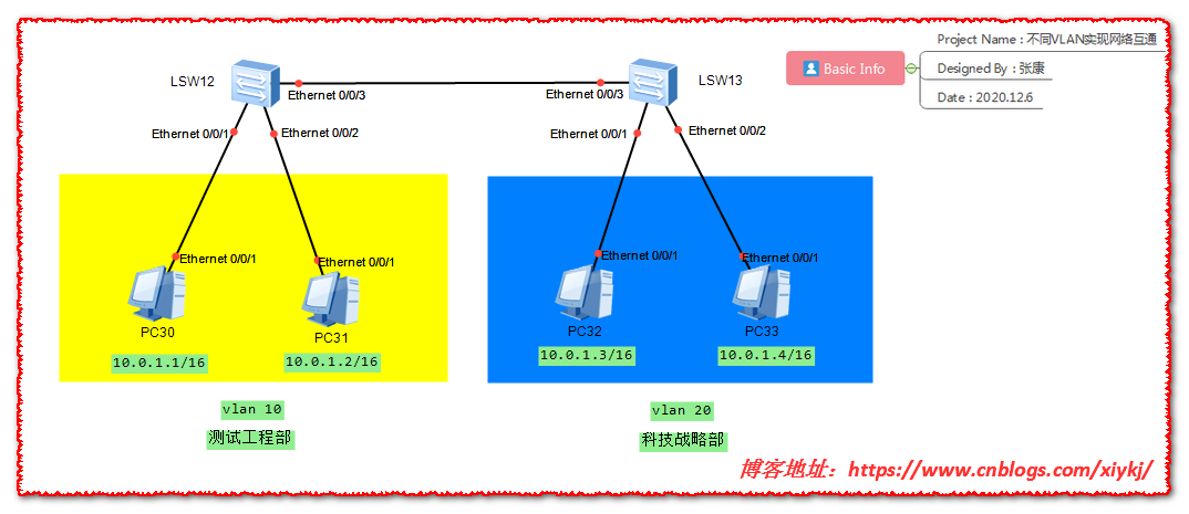 1. 两台交换机同一网段,不同VLAN实现网络互通,逻辑拓扑图如下: