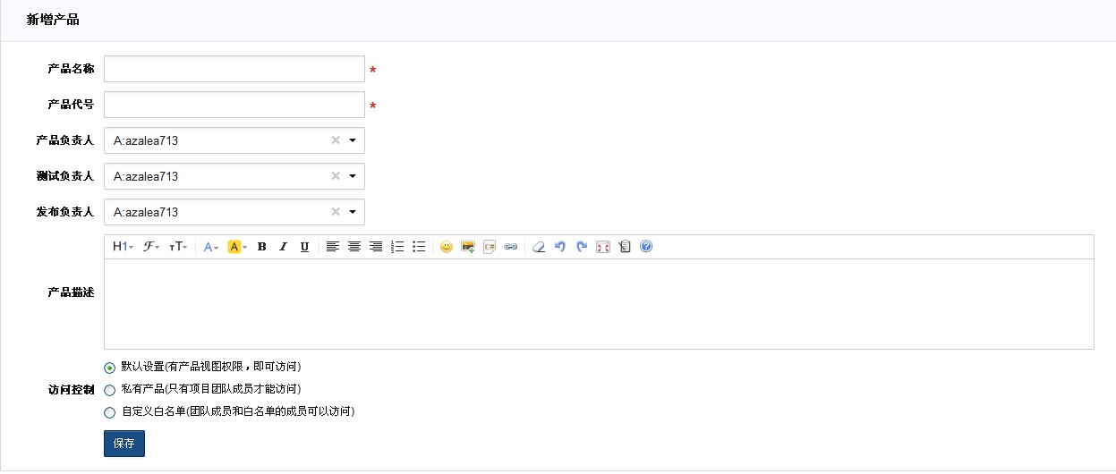 - 访问控制,则可以控制访问该产品的人员列表。比如可以将某一个产品设为私有,只有产品添加者、产品负责人、测试负责人、发布负责人以及该产品的项目团队才可以访问。