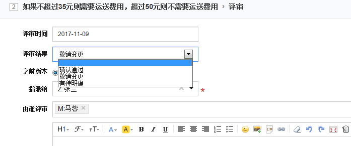 - 如果选择“有待明确”,会保持需求的草稿状态,并将需求指派回需求的创建者头上,有其继续进行完善。