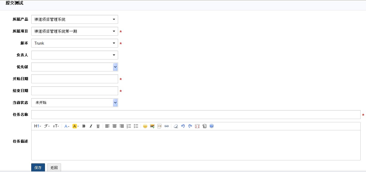 注意事项:1.负责人为本次测试的负责人2.可以指定本次测试预计起止时间3.任务描述里面可以注明此次测试需要注意的地方