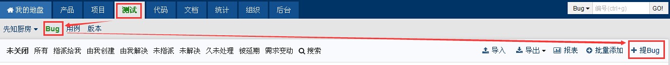 1.进入测试视图的“Bug”