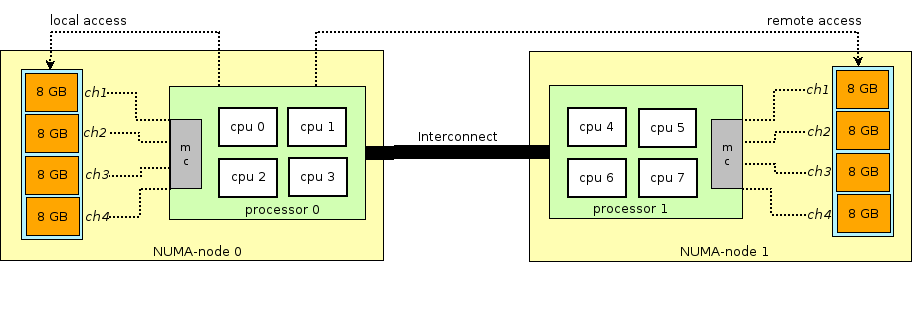 $ yum install -y numactl$ numactl --hardware available: 2 nodes (0-1) node 0 cpus: 0 2 4 6 node 0 size: 32690 MB node 0 free: 19579 MB node 1 cpus: 1 3 5 7 node 1 size: 32768 MB node 1 free: 19208 MB node distances: node 0 10: 10 201: 20 10