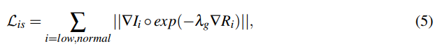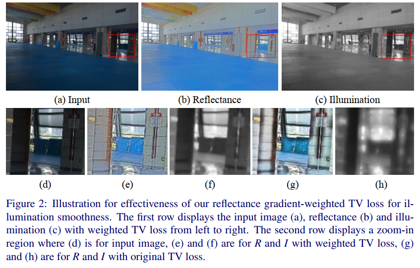 虽然LIME也考虑了在有加权TV约束的照明映射中保持图像结构,但我们认为这两种方法是不同的。对于LIME,使用初始光照图对总变异约束进行加权,初始光照图是R、G和B通道中每个像素的最大亮度。我们的结构感知平滑损失是由反射率加权的。在LIME中使用的静态初始估计可能不能像反射率那样描述图像结构,因为反射率被假定为图像的物理属性。由于我们的解网是离线训练的大规模数据,在训练阶段可以同时更新光照和权重(反射率)。
