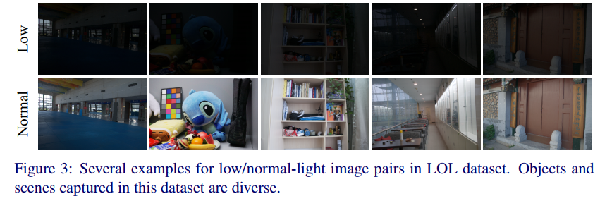 我们的数据集,命名为低光配对数据集(LOL),包含500对低/正常光图像。据我们所知,LOL是第一个包含来自真实场景的用于弱光增强的图像对的数据集。