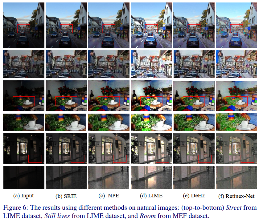 图6显示了三幅自然图像的可视化对比。更多的结果可以在补充文件中找到。从每一个红色矩形中可以看出,我们的方法在不过度曝光的情况下,充分地提高了隐藏在暗亮度下的物体的亮度,这得益于基于学习的图像分解方法和多尺度定制光照贴图。与LIME相比,我们的结果没有部分过度暴露(看看静物中的叶子和室外的叶子)。与DeHz相比,这些物体没有暗边,DeHz受益于加权电视损失条款(见街道上房屋的边缘)。